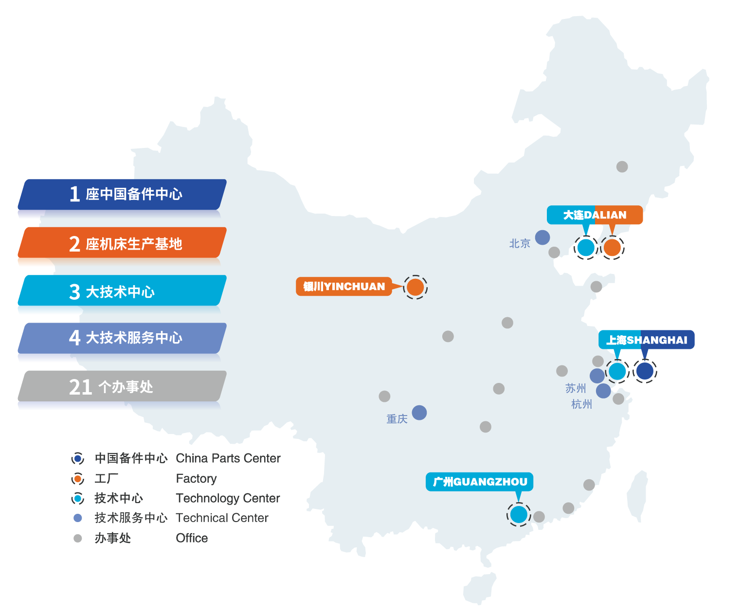 山崎马扎克(中国)有限公司是日本山崎马扎克株式会社在中国设立的全资子公司。全面负责马扎克在中国市场的研发、生产、销售和服务。通过长期投资,已建成了涵盖生产、销售、工程技术、售后服务、备件支持的全面客户支持体系,主要包括集备件、培训、服务为一体的全方位售后服务设施—山崎马扎克中国备件中心;2座先进的智能网络化工厂—宁夏小巨人机床有限公司(2000年),山崎马扎克机床(辽宁)有限公司(2013年);上海(2008年)、广州和大连(2010年)3处集展示、备件、培训和技术支持为一体的技术中心;北京、重庆、苏州、杭州4处技术服务中心及遍布全国的销售网点。