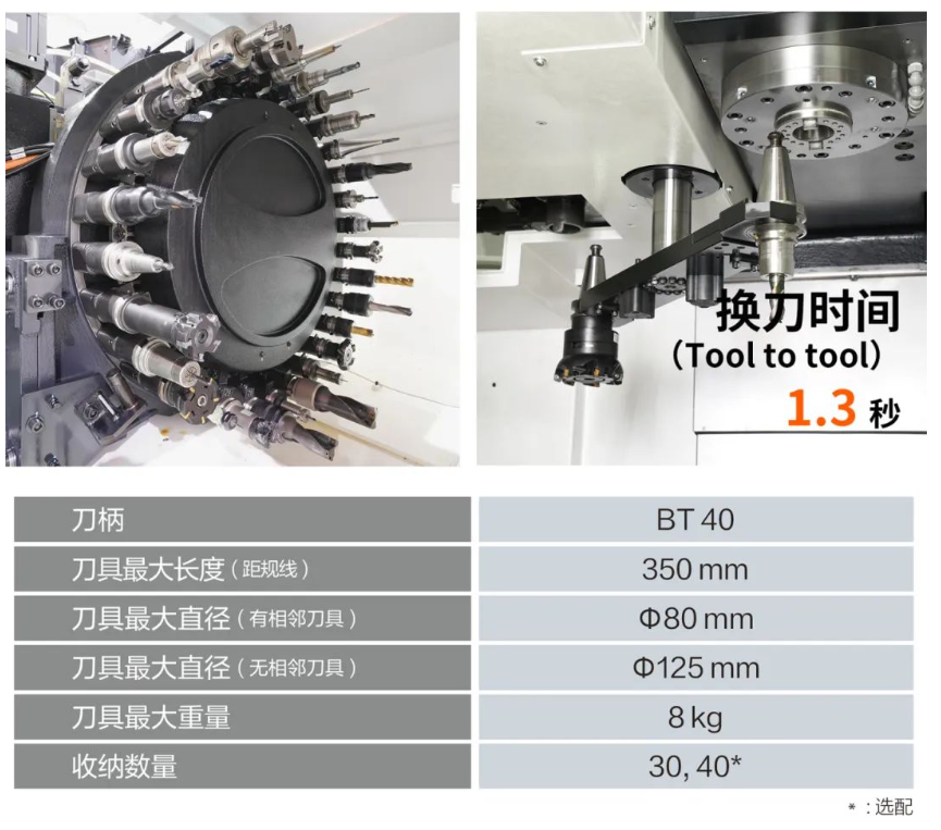 可收纳30把刀具。还有可收纳40把刀具的选配刀库,即使在加工多个种类的工件时,也能最大限度减少刀具准备作业时间。30刀位和40刀位刀库规格的安装面积相同。简单却有高度可靠性的凸轮驱动方式,通过高速换刀缩短了非切削时间,可长时间维持稳定动作。