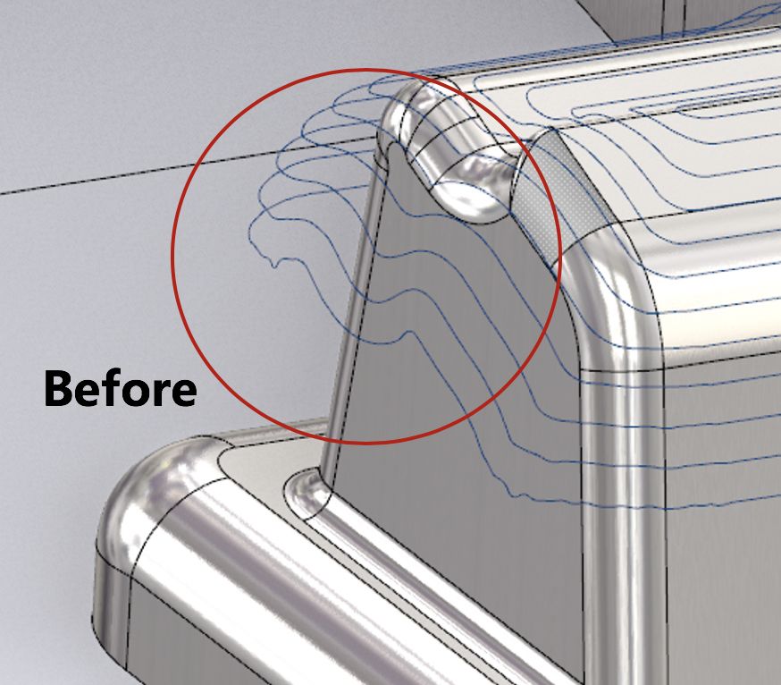 应用于混合及等距环绕加工策略;减少刀具轨迹噪声,使刀路更平滑,达成更佳的表面质量。