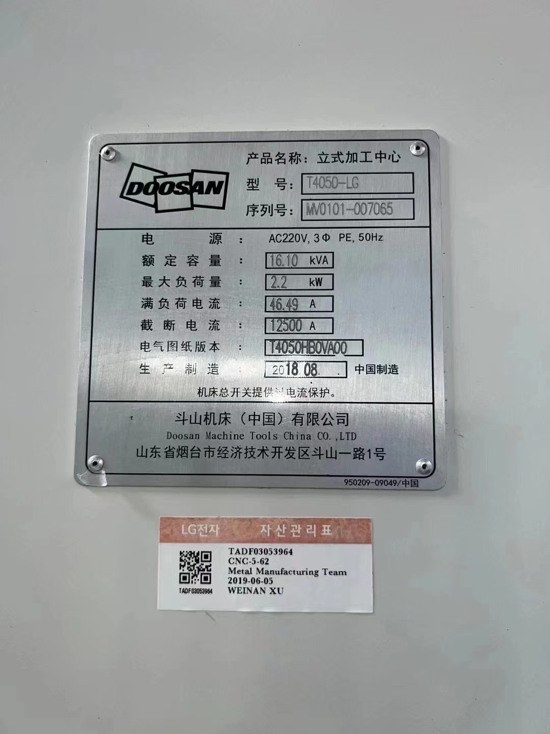 韩国斗山T4050钻攻中心 行程:520*400*480 BT30,21把刀,24000转 三菱M80A系统,2018-2019年产 带雷尼绍断刀检测,油雾分离器 可选配韩国原装第四轴,第五轴